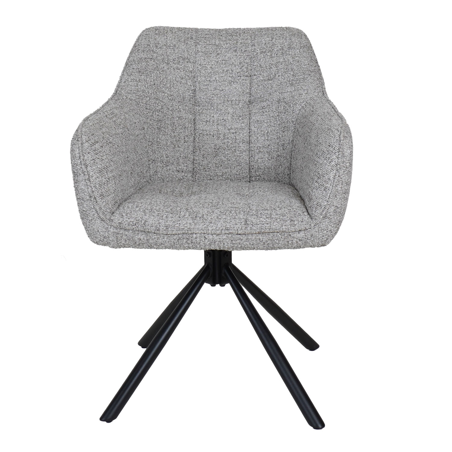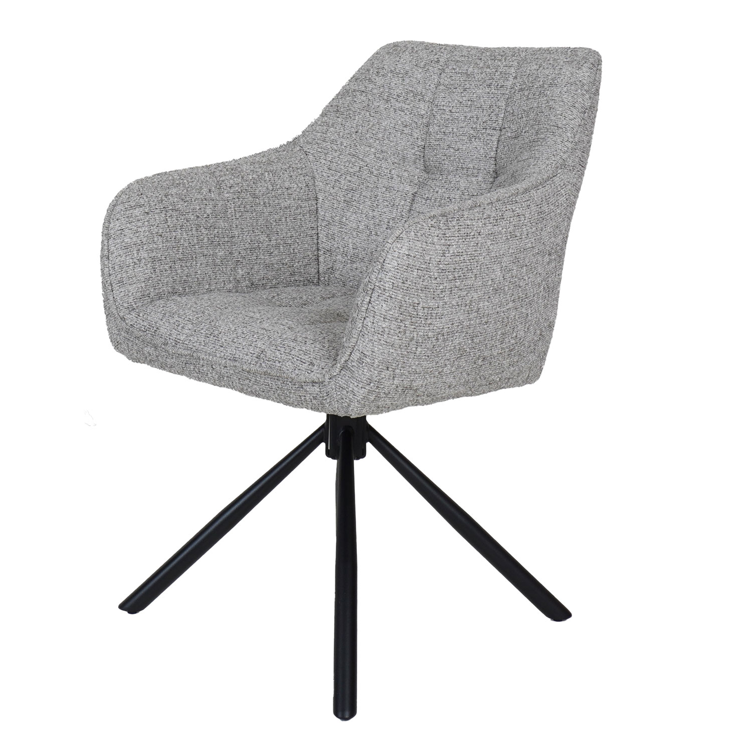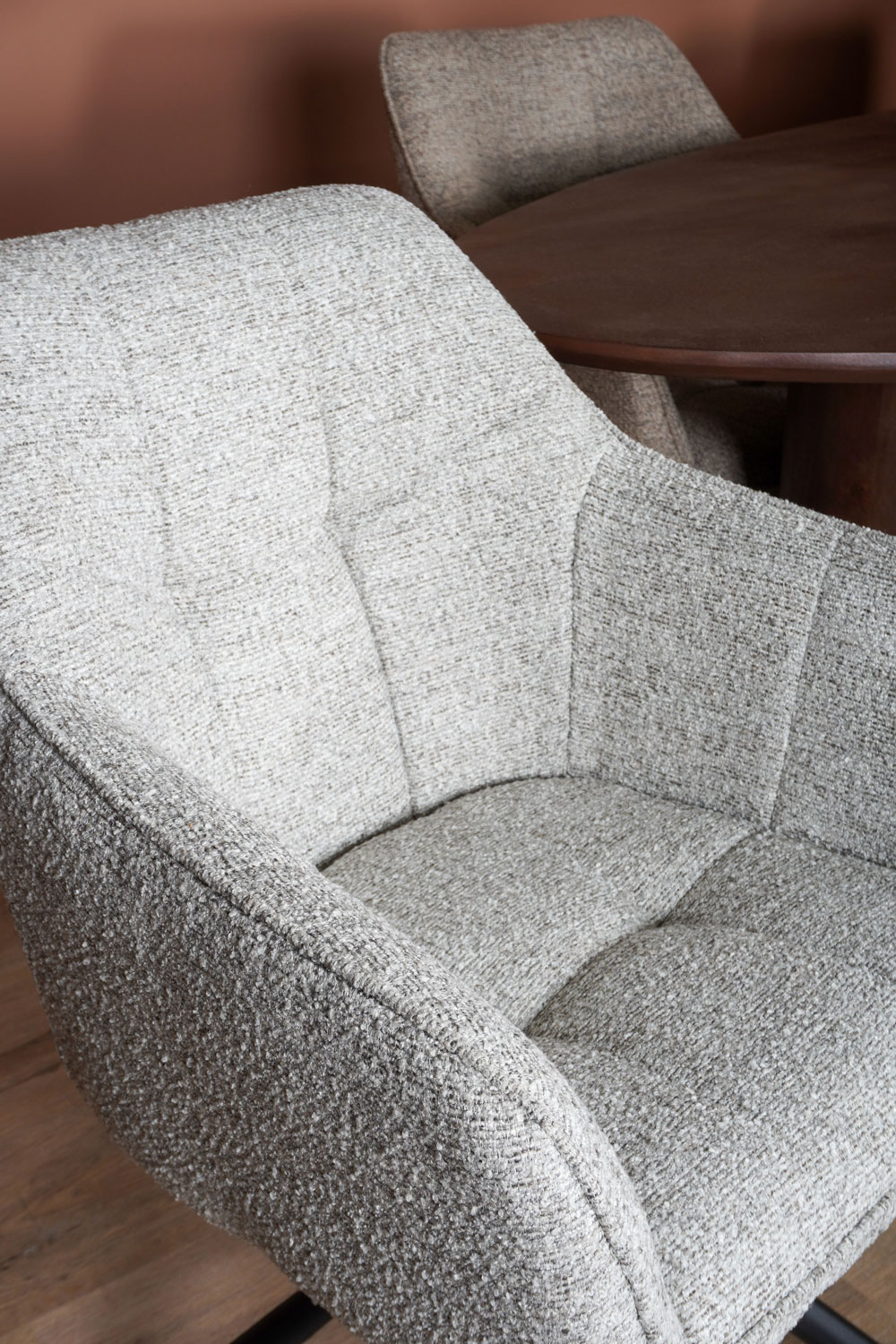 Eetkamerstoel Chris combineert modern design met optimaal zitcomfort. De stoel is bekleed met een zachte stof met een subtiele textuur die een warme en eigentijdse uitstraling geeft aan je interieur. Dankzij de kuipvormige zitting met armleuningen en de comfortabele vulling biedt Chris uitstekende ondersteuning, ideaal voor lange diners of gezellige avonden aan tafel.