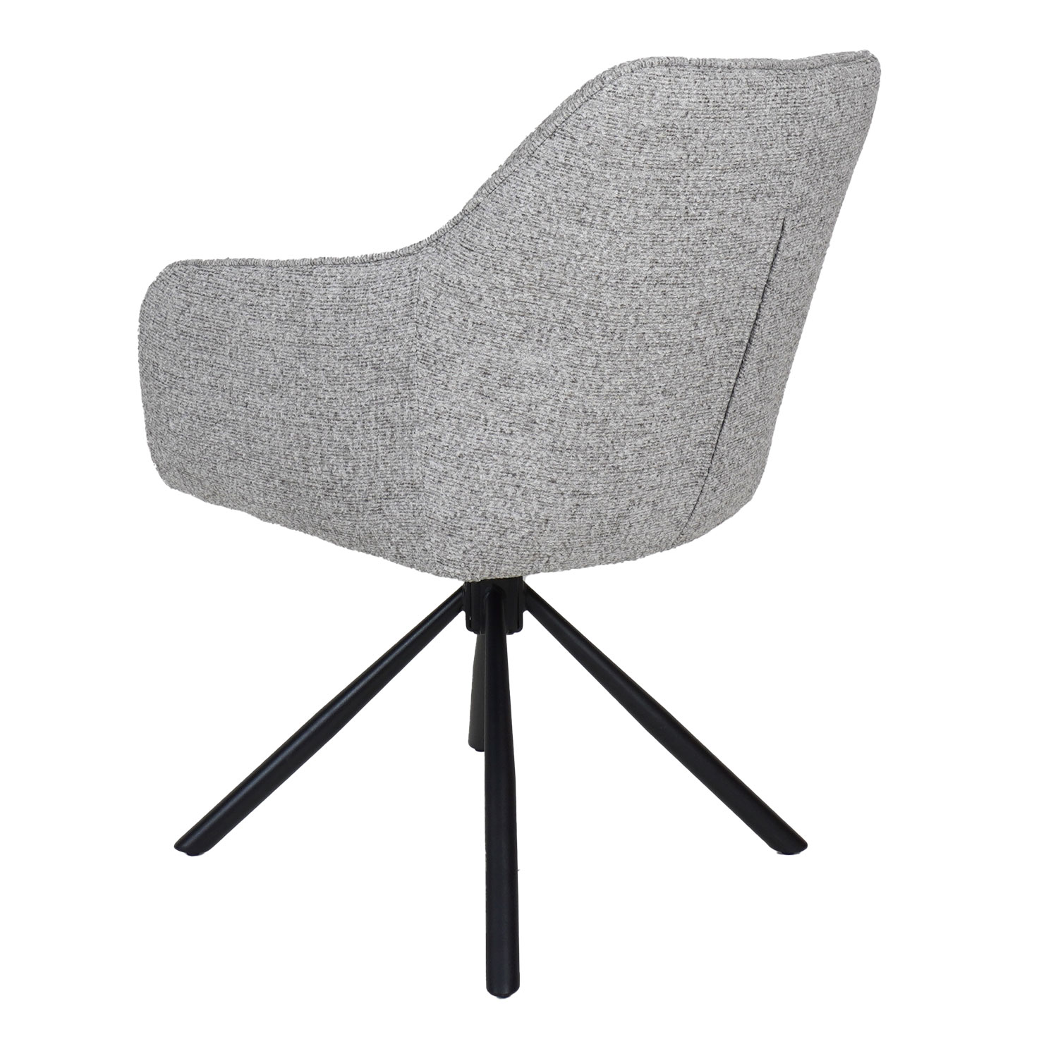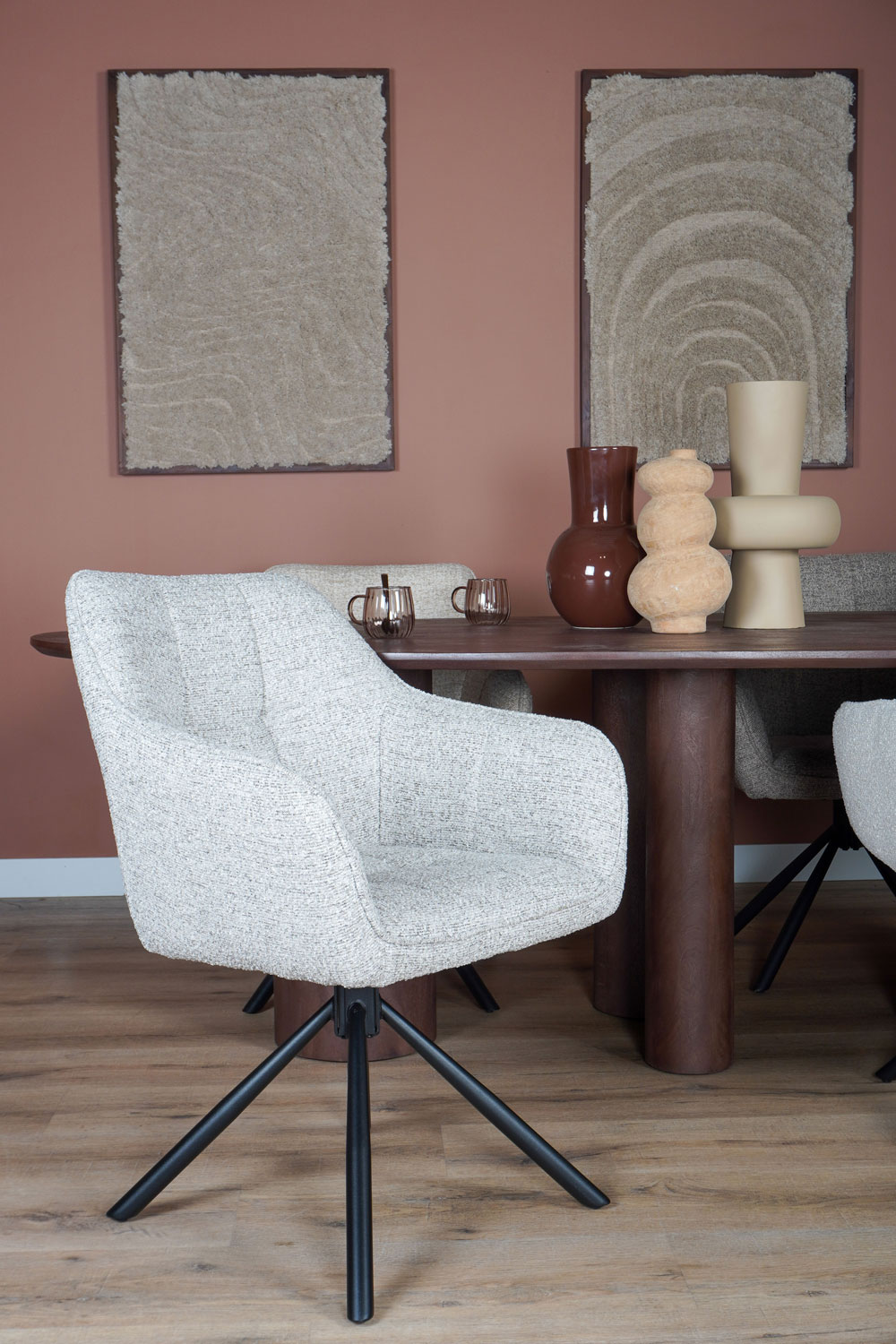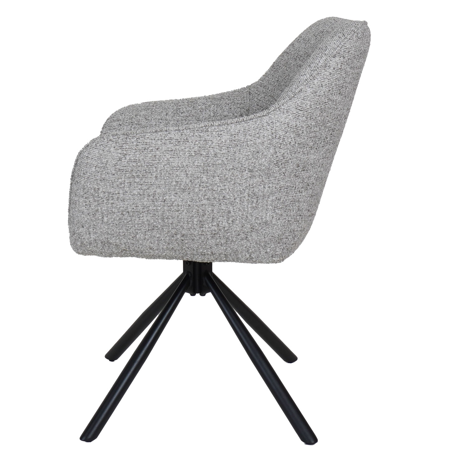 Eetkamerstoel Chris combineert modern design met optimaal zitcomfort. De stoel is bekleed met een zachte stof met een subtiele textuur die een warme en eigentijdse uitstraling geeft aan je interieur. Dankzij de kuipvormige zitting met armleuningen en de comfortabele vulling biedt Chris uitstekende ondersteuning, ideaal voor lange diners of gezellige avonden aan tafel.